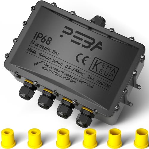 PEBA® IP68 Vattentät kopplingslåda, 6-vägs kopplingsdosor, utomhus vattentät Kabelkontakt, anslutningsbox, kopplingsdosa, fördelningsdosa, kabelanslutning för Ø 4 mm till 14 mm kabel, svart