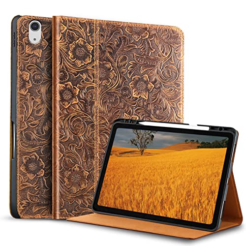 Gexmil Fodral för iPad 10,9 Tum,10:e Generationen(2022) Cover,Real Leather med Pennhållare,Automatyczne Usypianie/Czuwanie,Regulowany Stojak,Halkskydd,Anti-fingeravtryck,Flower Brown-US