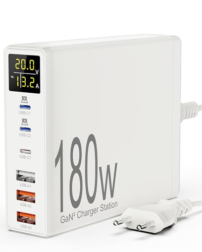 Sanicata USB C-laddare multipel 180 W, PD3.0 QC4.0 GAN snabbladdare med LCD-skärm, 6 portar laddningsstation, laddare typ C för MacBook Air, iPhone, iPad, Samsung, Huawei, Pixel