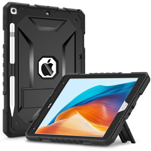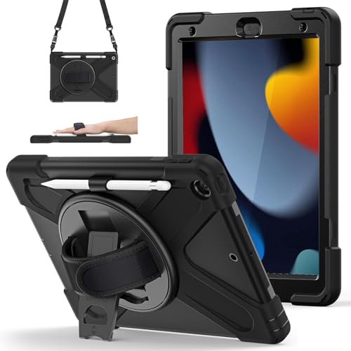 Junfire iPad 9:e generationen stötsäkert fodral, iPad 8th/7:e generationen 10,2 tum skyddsfodral med 360 graders vridbart stativ, handledsögla, axelrem och pennhållare 2021/2020/2019 – svart