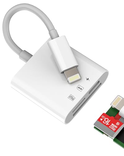 Omivine 3-i-1 SD-kortläsare för iPhone, SD och TF dubbla fack minneskortläsare för iPad, MicroSD-kamerakortadapter med laddning för Trail Game-kamera, drönare etc. Laddning och läsning samtidigt