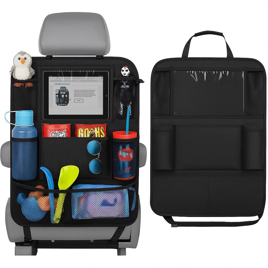 Trolsk Bil Baksätesförvaring (iPad) - Sparkskydd sätesskydd med surfplatteficka för iPad/surfplatta upp till 25x19 cm, monteras på nackstöd, svart