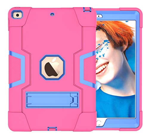 iPad 9.7 (2017/2018) 5./6 generationen fodral med kickställ, hållbar tung chockdoss-hybrid hård hybrid tre lager skydd skydd iPad surfplatta silikonskal (roserad + blå