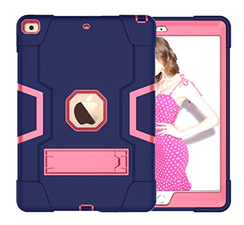 iPad 9.7 (2017/2018) 5./6 generationen fodral med kickställ, hållbar tung chockdoshybrid hård hybrid tre lager skyddande skydd iPad surfplatta silikon fodral (marinblå + rosened