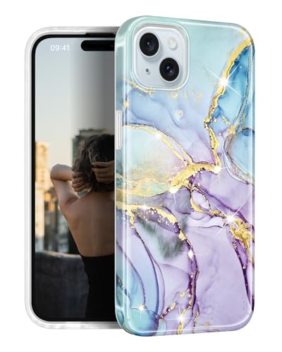 JIAXIUFEN Kompatibel med iPhone 15 fodral guld gnistrande glitter marmor design stötsäker skyddande smal mjuk TPU silikonskydd telefonfodral 6,1 tum 2023 lila blå