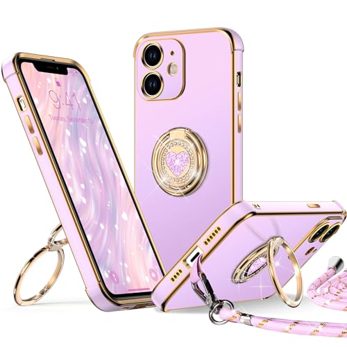XYZ för iPhone 11-fodral med stativ, dubbel ringhållare fodral hjärta med snodd för flickor kvinnor, lyxig söt bling skyddande telefonskal fodral för iPhone 11, lila