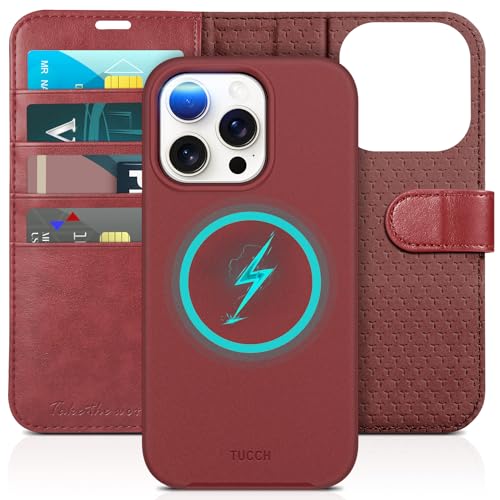 TUCCH Case for iPhone 15 Pro [Removable] 2-IN-1 Magnetic Protective Case [Wireless Charging] RFID Blocker Foldable Cover Compatible With iPhone 15 Pro 5G 2023 (6.1"), Dark Red