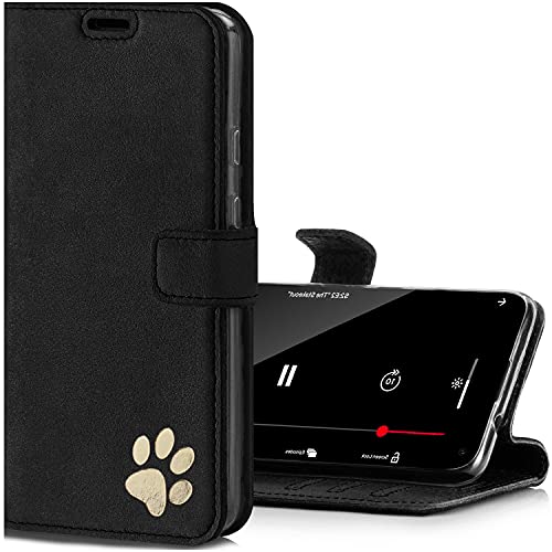 SURAZO Mobiltelefonskal för iPhone 12 – premium RFID äkta läderskal med tassmotiv – svart mocka vikbart fodral med stativfunktion handgjort i Europa för Apple iPhone 12/12 Pro
