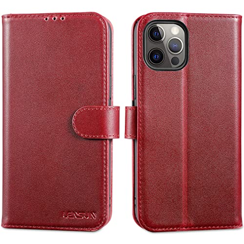 LENSUN äkta läderskal för iPhone 12, iPhone 12 Pro mobiltelefonfodral äkta läder skyddsfodral [RFID-blockerare] mobilväska läderskal för iPhone 12/12 Pro – vinröd