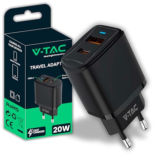 V-TAC 20 W USB-C snabbladdare för iPhone och Samsung - ultrasnabb laddare för smartphones och enheter - 2 portar USB typ C och typ A för iPhone 13/14/15/16 PRO/MAX och Galaxy S24/S25/S26