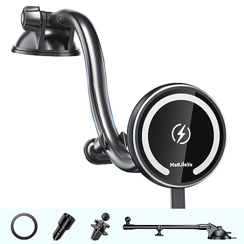 MAGJIEYX Passar Magsafe trådlös laddare, svanhals lång arm sugkopp, instrumentpanel/ventil/vindruta för iPhone 14/13/12-serien/MagSafe-fodral/med snabbladdning [18 W QC 3,0 adapter]