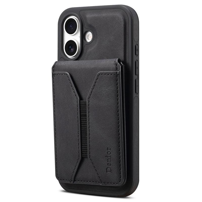 DENIOR D18 iPhone 16 Fodral Ring Ställ i Läder+PC+TPU - Svart