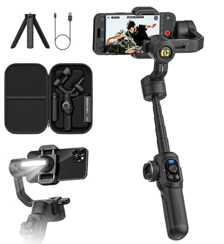 AOCHUAN Professionell stabilisator för smartphone, inbyggd 18 cm förlängningsstång och kraftfull fyllningsljus, 360° uppfattning, ansikts- och objektspårningsstabilisator, 3-axlad gimbal för iPhone