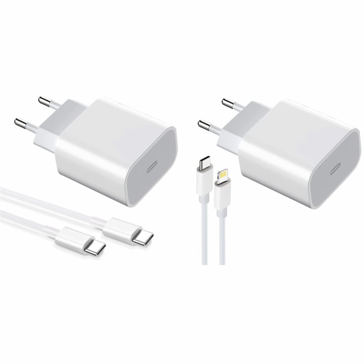 2-pack Laddare för iPhone / Android 20W med USB-C till Lightning och USB-C - Snabbladdare