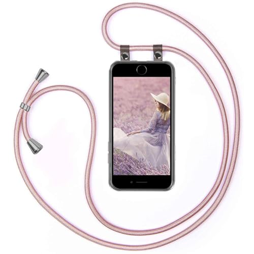 moex Mobiltelefon kedja kompatibel med iPhone 7 Plus/iPhone 8 Plus – silikonskal med band – mobiltelefon fodral att hänga – fodral transparent med sladd – skyddande hölje med snöre, utbytbar i roséguld