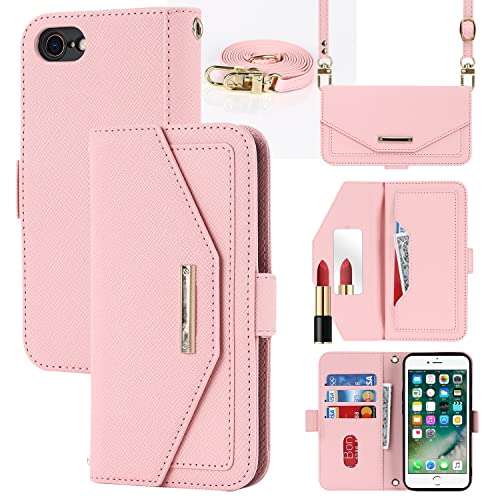 Copmob sladd fodral iPhone 7/8/SE 2020/SE 2022, Flip plånbok läderfodral, [spegel][5 spår][magnetisk stängning], justerbart klämskydd för iPhone 7/8/SE2/SE3 - rosa