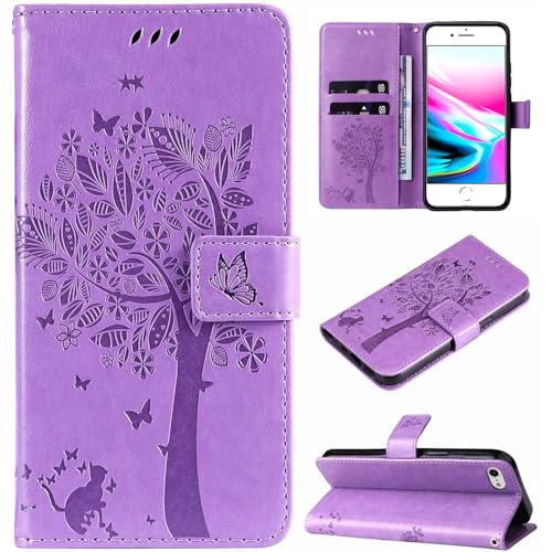 Hancda Fodral för iPhone SE 2022/iPhone SE 2020/iPhone 8/iPhone 7 läderfodral plånbok flipfodral med korthållare spår designmönster magnetiskt stativ rem stöttåligt telefonfodral, lila