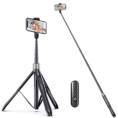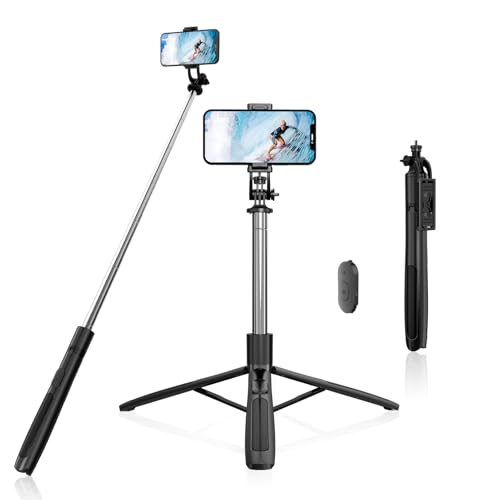 ATUMTEK 161 cm Selfie-Stick-stativ med avtagbar mobiltelefonhållare och fjärrkontroll, kompatibel med iPhone, Samsung och Android-smartphones, batteridriven, svart