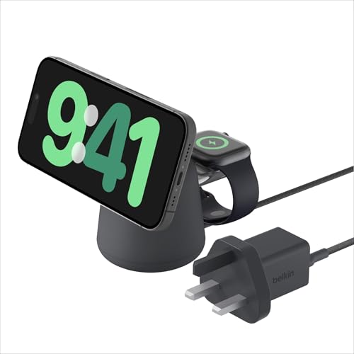 Belkin BoostCharge Pro 2-i-1 trådlös laddningsdocka med MagSafe 15 W snabbladdande iPhone-laddare kompatibel med iPhone 17, Air, 16, 15, 14 och 13-serien, AirPods och andra MagSafe-aktiverade enheter