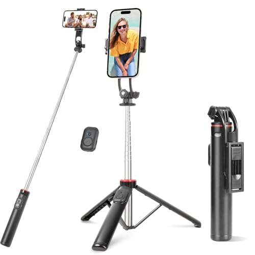 ATUMTEK 161 cm Selfie-Stick-stativ med avtagbar mobiltelefonhållare och fjärrkontroll, kompatibel med iPhone, Samsung och Android-smartphones, batteridriven, svart