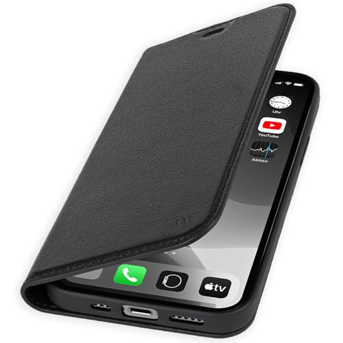 WIIUKA Fodral för iPhone 15 Pro, läder från Tyskland, med kortfack, extra tunt, mobiltelefonfodral med stativfunktion, svart väska