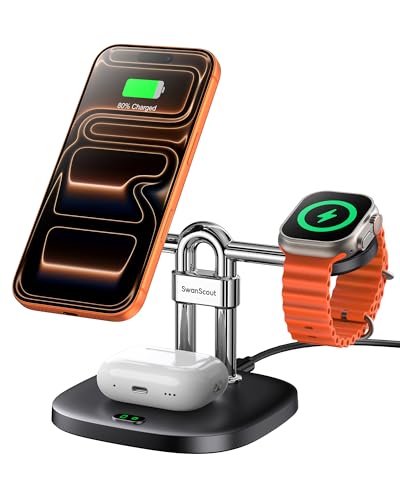 SwanScout 3-i-1 Trådlös Laddare för i-Phone med MagSafe, Magnetisk Wireless Charger Induktiv Laddningsstation för i-Phone 17/Air/16/15/14/13, Apple Watch 11/10/9/Ultra 3/SE 3, AirPods(utan adapter)