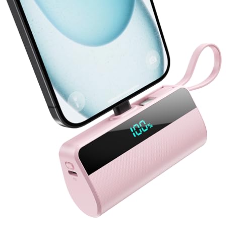 Externt batteri för iPhone, 5 500 mAh Mini Power Bank med inbyggd USB C-kabel, 20 W PD snabbladdning, bärbar LCD-skärm, bärbart batteri, kompatibelt med iPhone 16/15/14/13/12/11/X/8/7-rosa