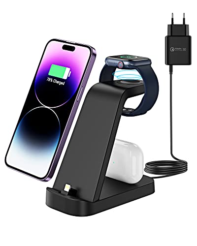 Apetiy 3-i-1 snabbladdare för Apple Watch laddningsstation Ultra 8/7/6/SE/5/4/3/2 trådlöst laddningsstativ, 18 W snabb bärbar laddningsstation för iPhone 14/13/12/11/XS/XR/8/7, AirPods serie