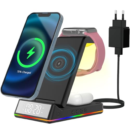 PINRUIGE Trådlös laddare Med klocka och nattlampa, 5-i-1 induktiv laddningsstation Wireless Charger Kompatibel med iPhone 15 14 13 12 11 Pro Max/XS/XR/X/8, iWatch Ultra/8/7/6/SE/5/4/3/2, AirPods Pro