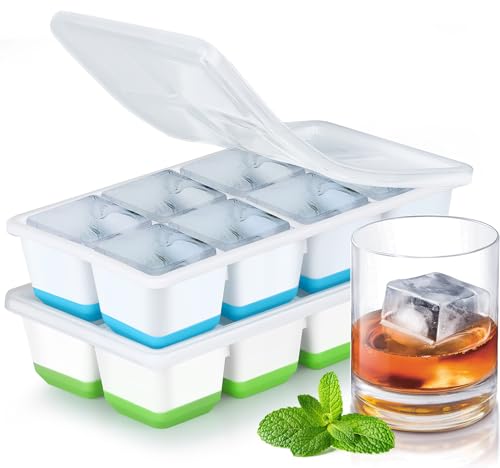 Stor Isform med Lock, JRISBO 2-pack Iskubsform Silikon Isbitsform BPA-fri och Stapelbar, Säker Premium Large Ice Cube Tray Iskubsbricka Isbricka för Barnmat Cocktail Whisky Öl (Blå + Grön)