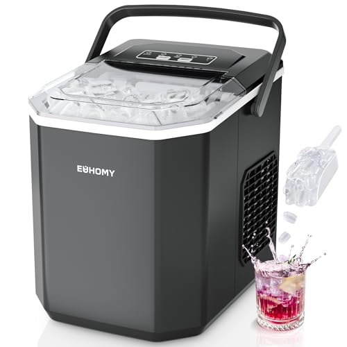 EUHOMY Isbitsmaskin liten, 9 tärningar på 6 minuter, 12 kg/dag, självrengörande, bärbar ismaskin med bärhandtag, korg och spade, 2 storlekar av isbitar för hem, kök, svart