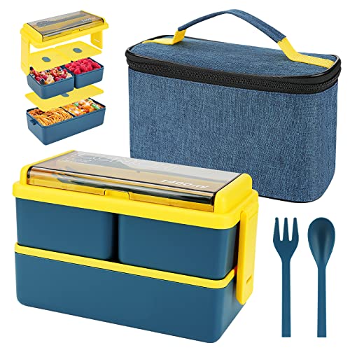 1 400 ml lunchlåda med 3 fack – 2 lager läckagesäker bentolåda med isolerad påse och bestick, måltidsförberedelsebehållare låda för vuxna barn studenter kontor mikrovågsugn säker tillgänglig (blå)