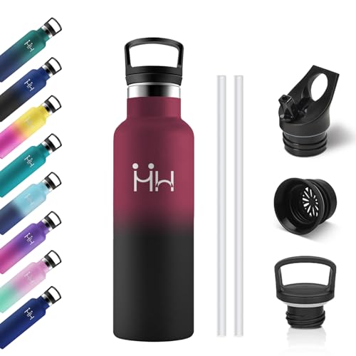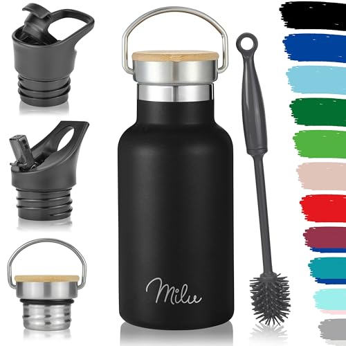 Milu Dricksflaska i rostfritt stål, 350 ml, 500 ml, 750 ml, 1 000 ml (+3 lock) termosflaska med sugrör, isolerad vattenflaska för barn, vuxna, för resor, läckagesäker (svart, 350 ml)