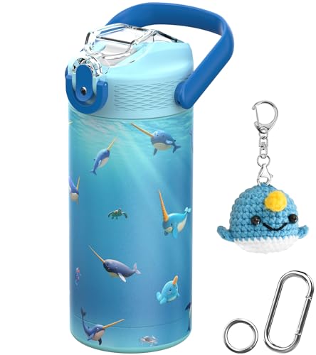 MYFOREST 400ml isolerad vattenflaska för barn, luktfri kirurgisk innerflaska, diskmaskinssäker, namnprick, mjuk sippra (Havet. Narvalar)