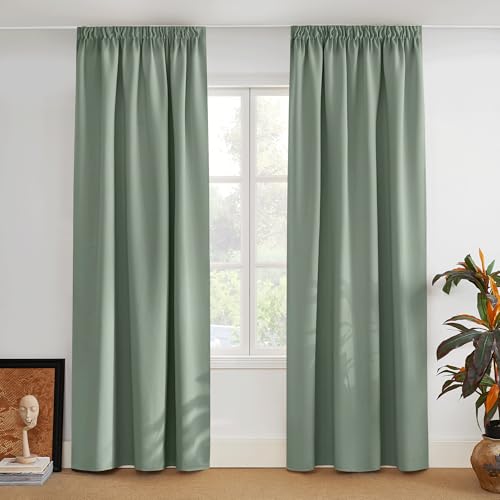 Pony Dance mörkläggningsgardiner med veckband, för skena, set med 2 stycken ogenomskinliga gardiner, H 220 x B 140 cm, värmegardin, för vardagsrum, isolerande mot kyla, salviagrön
