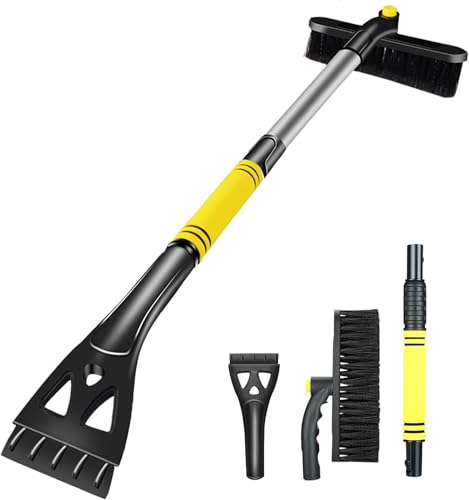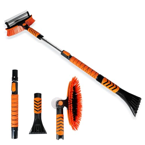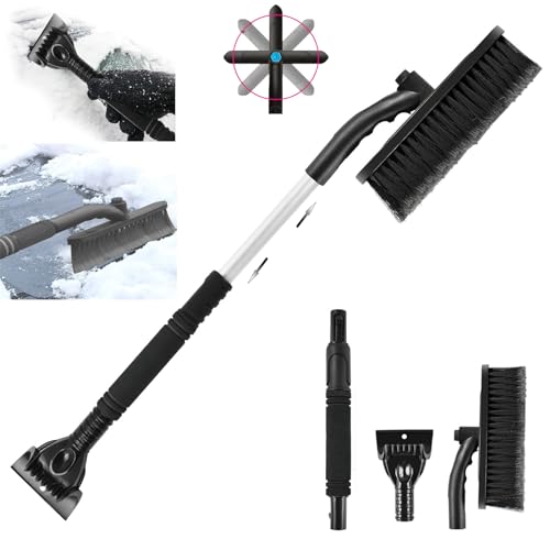 FINEVERNEK Isskrapa för bil med borste, avtagbar 3-i-1-teleskops-isskrapa, med snöborste, för bil, med 360° roterbart huvud och halkfritt skumhandtag