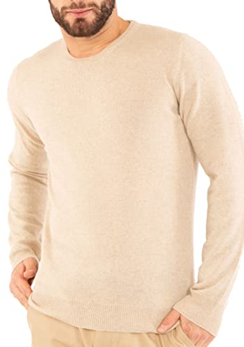CASHMERE ZONE - Herrtröja Med Rund Hals, 30% Kashmir 70% Ull, Tillverkad i Italien, Långärmad Tröja, Vintertröja (L, Beige)