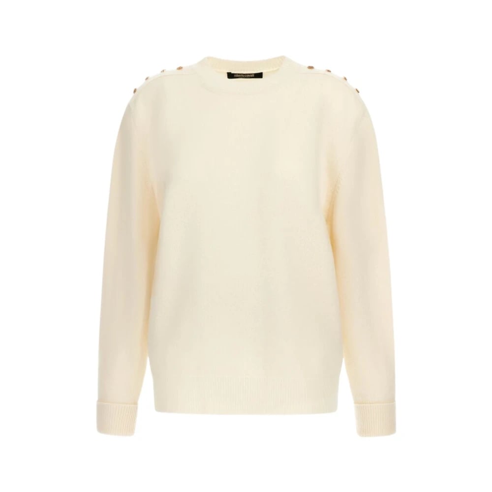 Roberto Cavalli, Stickade Tröjor , Dam, S, Ivory Rund Hals Tröja Tillverkad i Italien