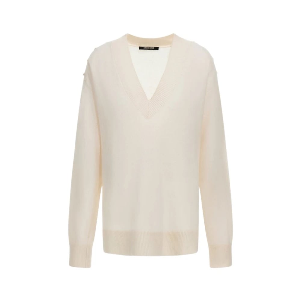 Roberto Cavalli, Stickade Tröjor , Dam, L, Vit V-ringad Tröja Tillverkad i Italien