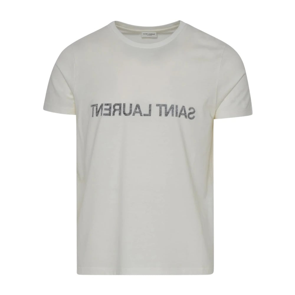 Saint Laurent, Toppar , Herr, L, Bomull, Ivoire bomull T-shirt med ribbad rund hals