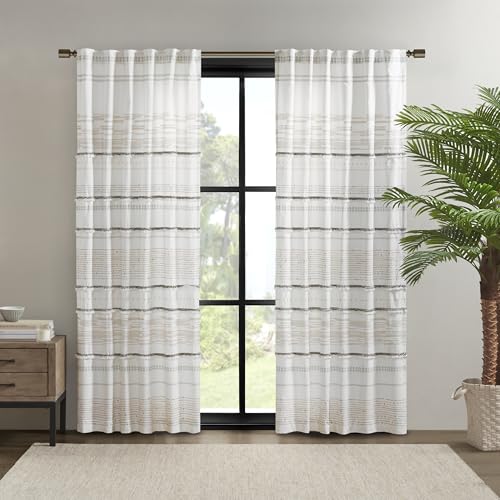 INK+IVY NEA 100% Cotton Single Panel Curtain Stripes Tassels Trim Boho Design Rod Pocket Top Drape for Living Room, Privacy Window Treatment for Bedroom, 50" x 84", Off White/Gray