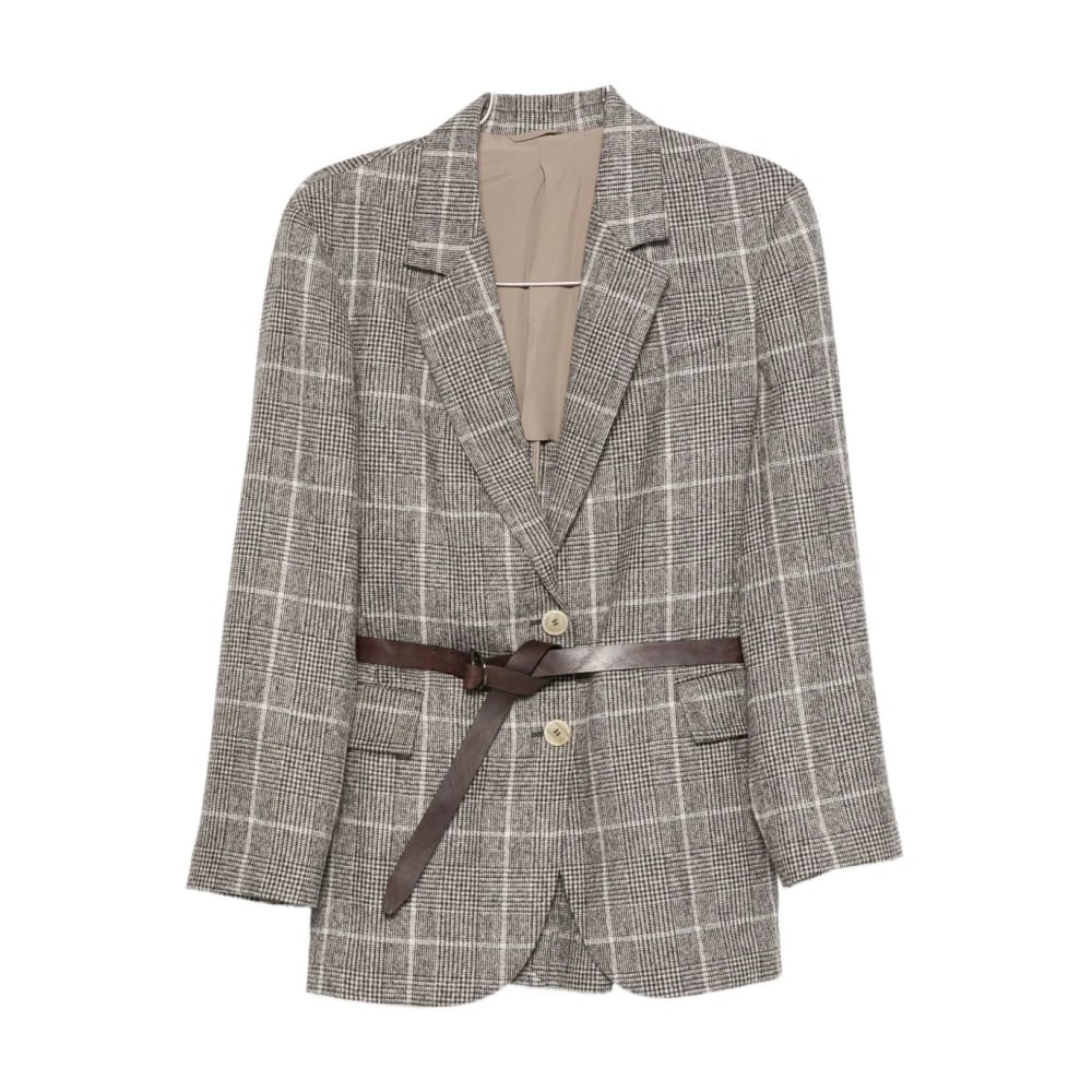 Brunello Cucinelli, Jackor , Dam, S, Rutig Mönstrad Brun Jacka med Bälte