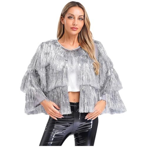 Sywiyi Glittrande jacka för kvinnor, bomberjacka med fransar, tofsar, temafest, karneval, fest, kostym, disco outfit, silver, XL