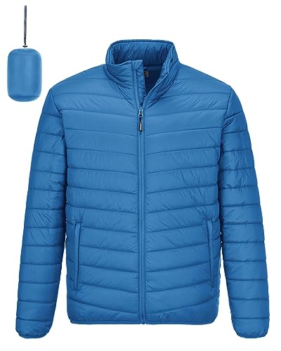 Outdoor Ventures herr quiltad jacka packbar lätt varm övergångsjacka herr vattentät pufferjacka med 3 fickor för utomhus casual vandring, Klassisk blå, L