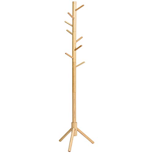 IBUYKE Massivt träklädhängare i trä med 8 klädkrokar på stativet för förvaring av jackor, rockar, hattar, träfärg RF-1193