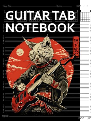 Guitar Tab Notebook: Samurai Japanese Cat Playing Guitar Blank 6 String Tablature with Chord Fingering Charts for Guitarists. 100+ Pages Manuscript Tab Music Sheets Journal