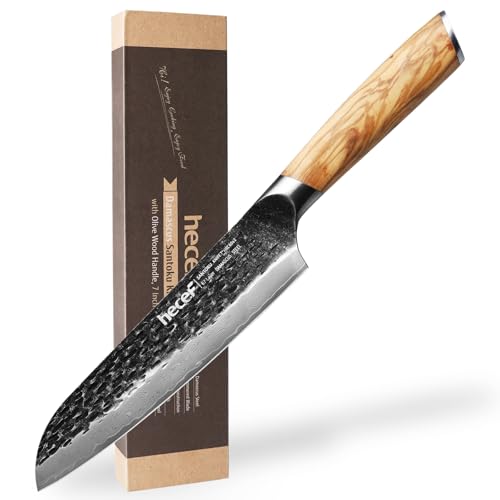 hecef Damaskuskniv Santokukniv - Kockkniv 18CM, ultraskarp japansk kniv, professionell kökskniv Skarp köttkniv - 67 lager av Damaskusstål och handsmidda handtag i olivträ