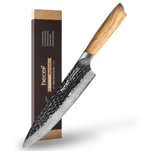 hecef Damaskuskniv Kockkniv 20CM, ultraskarp japansk kniv, professionell kökskniv Skarp köttkniv - 67 lager av Damaskusstål och handsmidda olivträhandtag