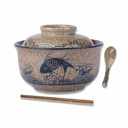 Keramiksoppskål-set, 800 ml ramenskål (ätpinnar sked), stora japanska noodle skålar, traditionella asiatiska bordsunderläggsset, för udon, pasta, fo, soba, flingor och sallad (fisk)