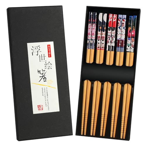 YT Direct 5 par japanska naturliga bambuätpinnar med unikt tryck, återanvändbara ätpinnar presentset för sushi-nudlar, kinesisk servis tvättbar för diskmaskin, 20 cm längd